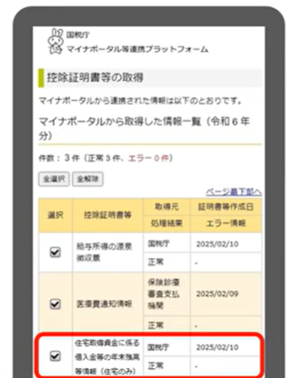 - 取得結果一覧に「住宅取得資金に係る借入金等の年末残高等情報」があることを確認