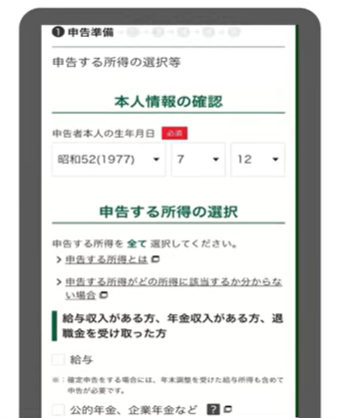 - 生年月日を確認→申告する所得を選択→【次へ】