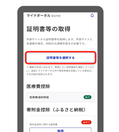 ・ 過去に利用したことがある場合は「証明書等の取得状況を確認する」→「証明書等を選択する」を押す