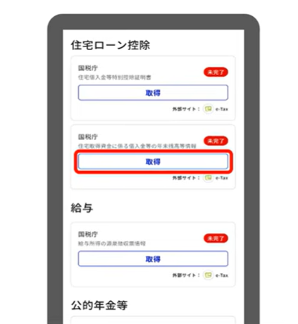証明書取得画面から住宅ローン控除「住宅取得資金に係る借入金等の年末残高等情報」欄の「取得」を押します。
