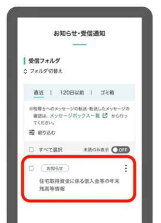 マイナポータル連携をし年末残高証明情報が取得可能になるとe-Taxのメッセージボックスに通知が届くようになります。