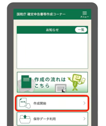 - 国税庁「確定申告書等作成コーナー」トップページを開き、「作成開始」をタップ